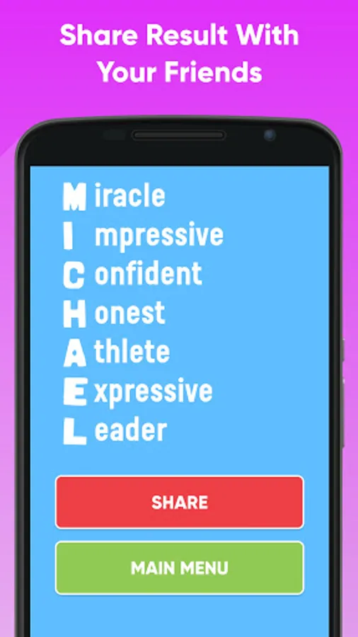 Take the name meaning test and show the results of the test with friends. Name meaning is a great app to play with your BFF's and family. Works for both boys and girls.