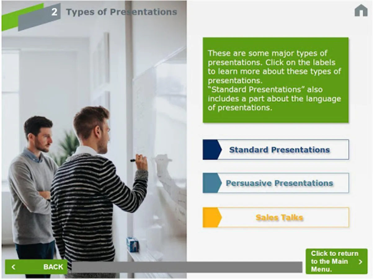In Standard Presentations, you will learn about the most basic form of presenting. You will also be given some helpful tips and phrases that you can immediately use for your next presentation, as well as see and hear a few examples.