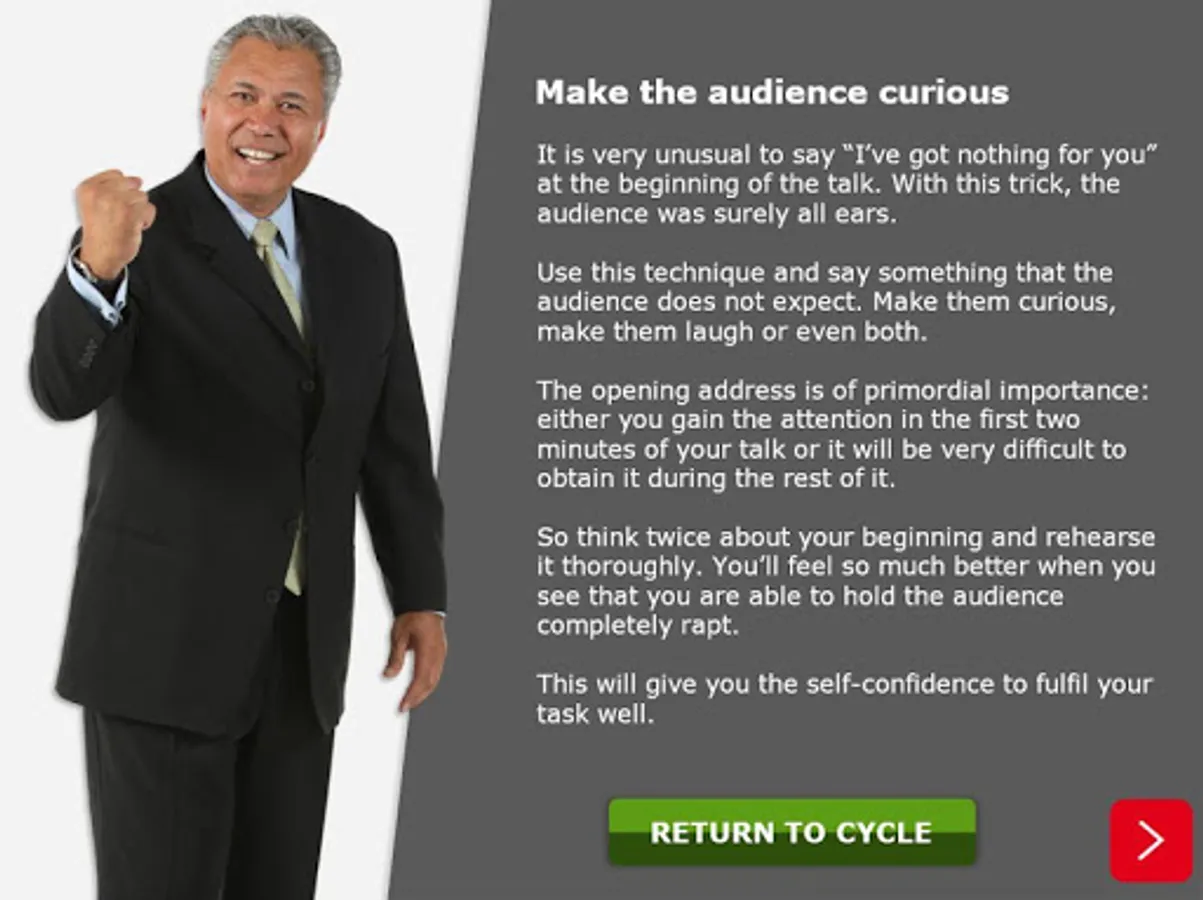 The Non-Verbal Skills chapter will help you develop your body language tactics to send the correct message to your audience without speaking. These skills are just as important as your speaking skills, so the advice in this chapter will help you to stand confident in front of your audience.