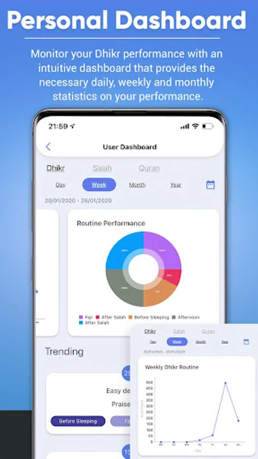 Track the number of pages you read of the Quran on any given day and monitor your weekly and monthly performance.