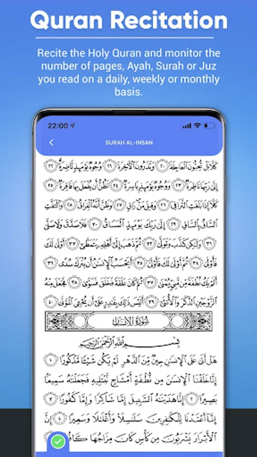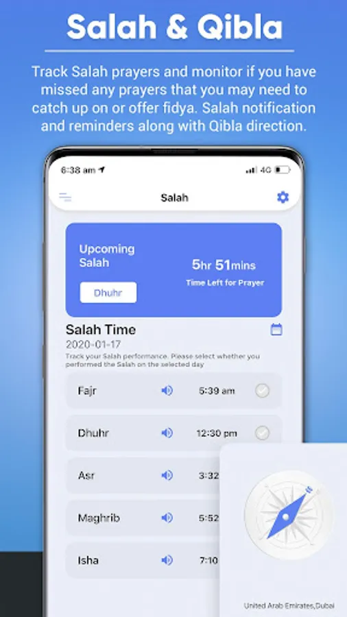 Track Salah prayer times and get notified in advance. Record your Salah performance through the app.