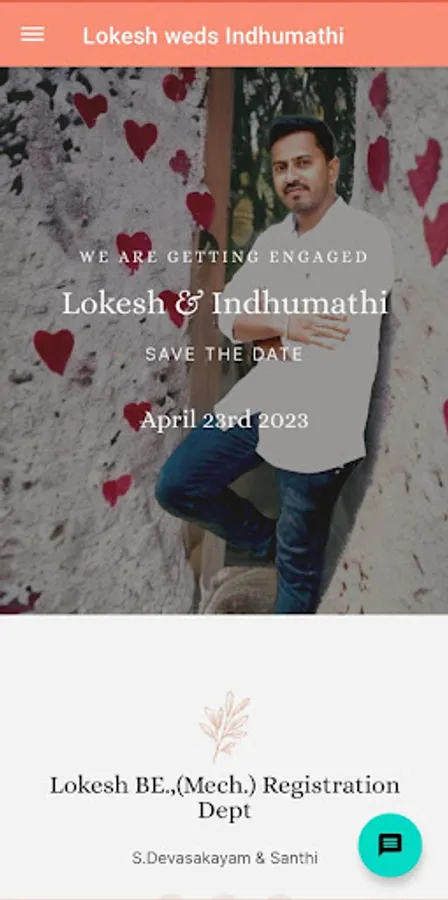 This is Lokesh wedding invitation app, This app contains marriage invitation with download option, events to be held on marriage ceremony , time schedules and route maps.