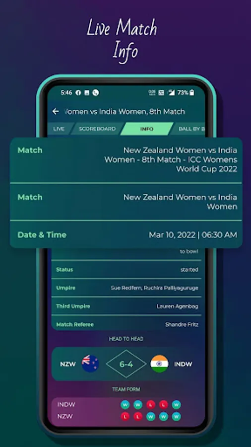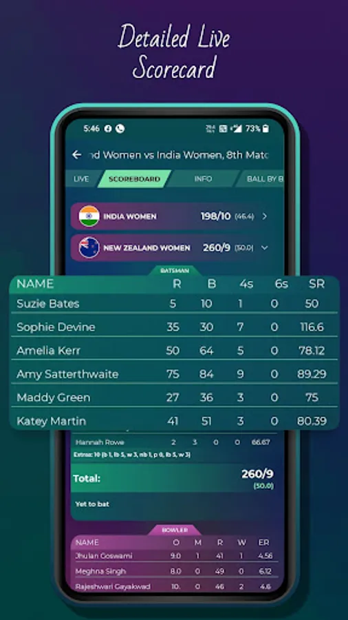 We provide a detailed live scorecard for both teams where you get details of a batsman, bowling, fall of wicket, partnership with auto-refresh.