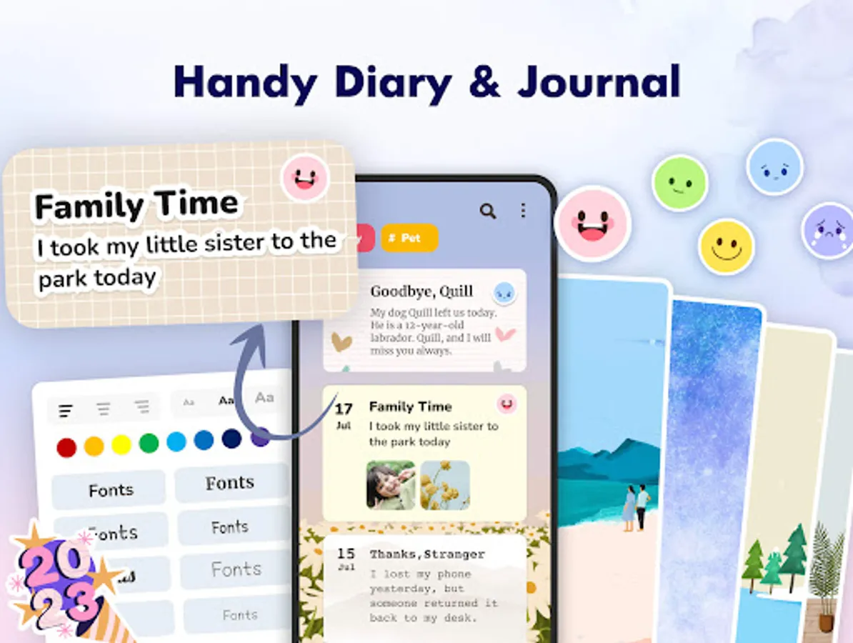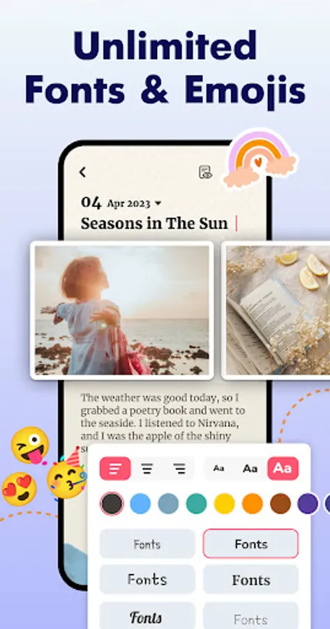 We provide unlimited entry editing options, pictures, emojis, moods, etc. Also, you can decorate your entries with stylish fonts and backgrounds.