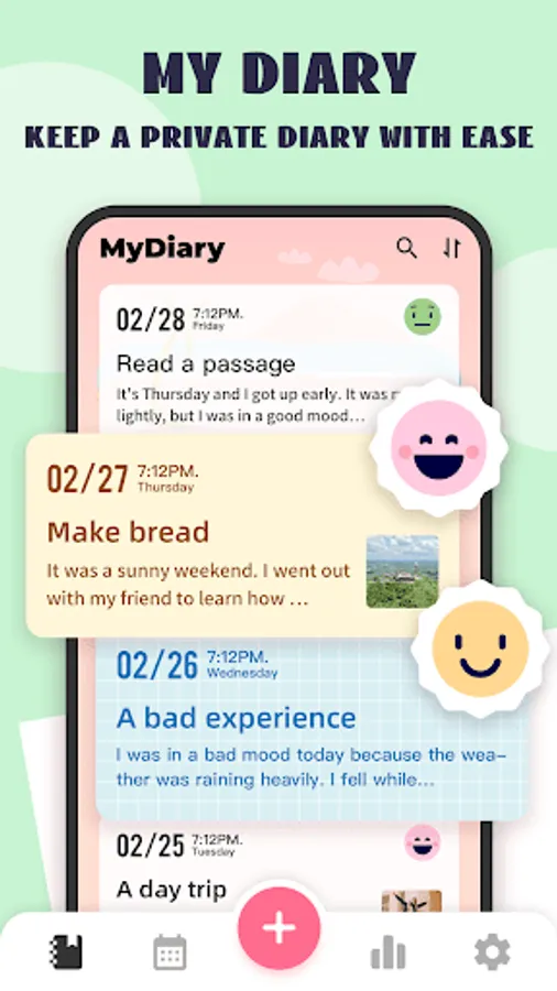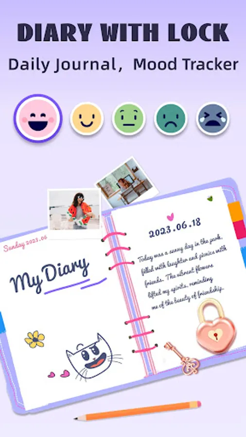 My Diary - the free diary journal app with lock, your private thoughts will remain secure and confidential. You can use it to record daily diary, secret thoughts, journeys, moods, and any private moments. With this journal app, you can record daily thoughts and track daily mood changes. 🛡️🔐