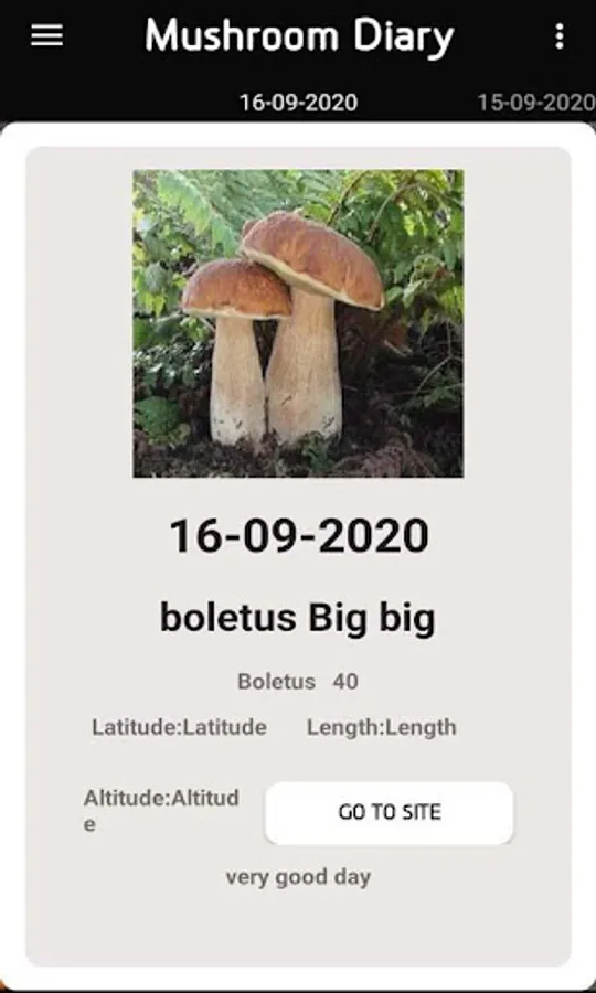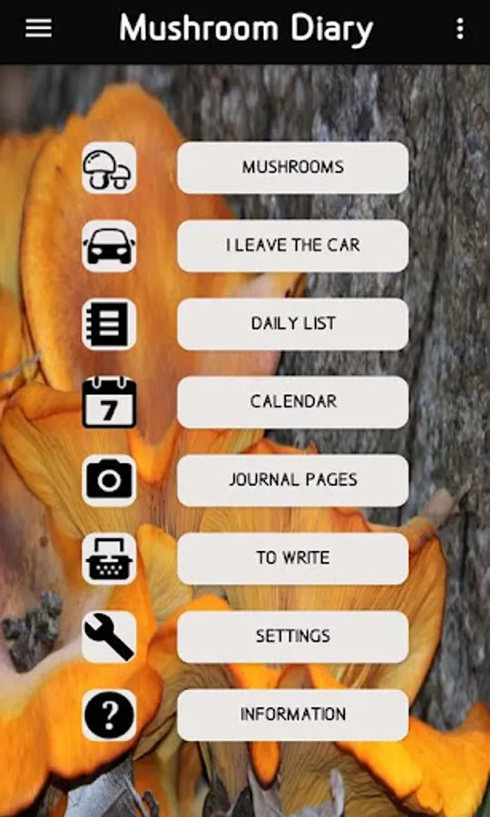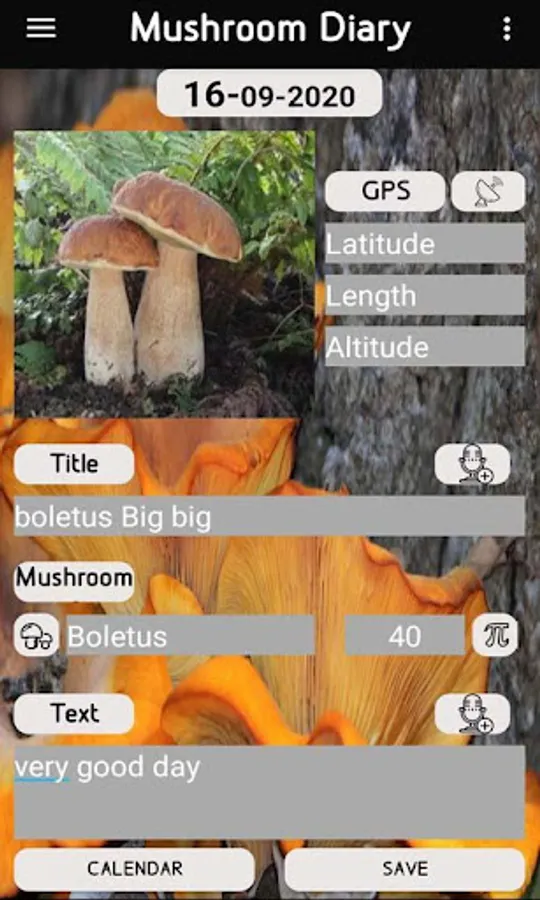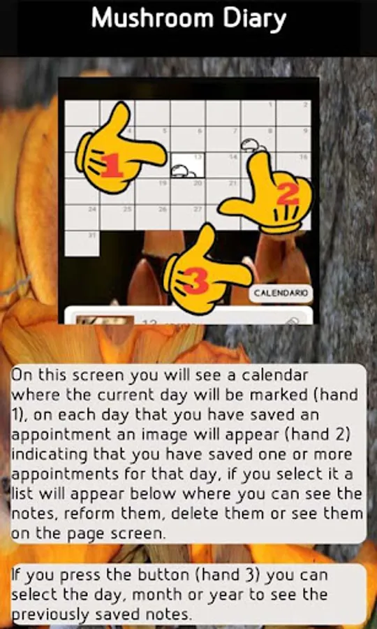 A diary about your life as a mycologist, you will be able to remember where you caught a mushroom , which mushrooms you have caught, where you left the car, with whom you have gone to catch mushrooms and all the adventures and curious situations that occur to you, and then remember them in different ways, in the form of a calendar, with a list of your races or in the form of a book.