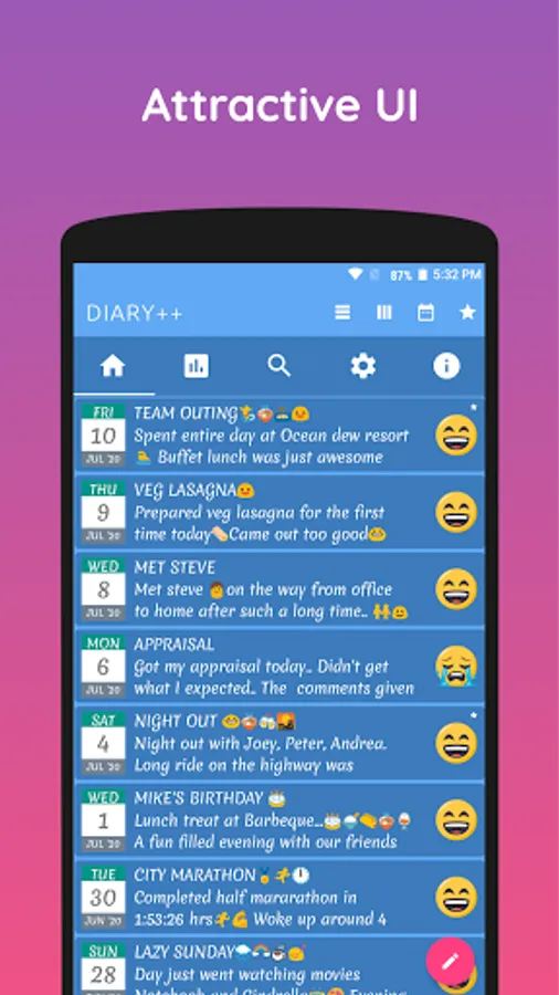 Your diary entries can be viewed in three different ways using the List view, Column view, and Calendar View. List view lets you scroll through all the diary entries. Column and Calendar Views let you pick up a particular date and see the corresponding diary content. Please refer to our screenshots.