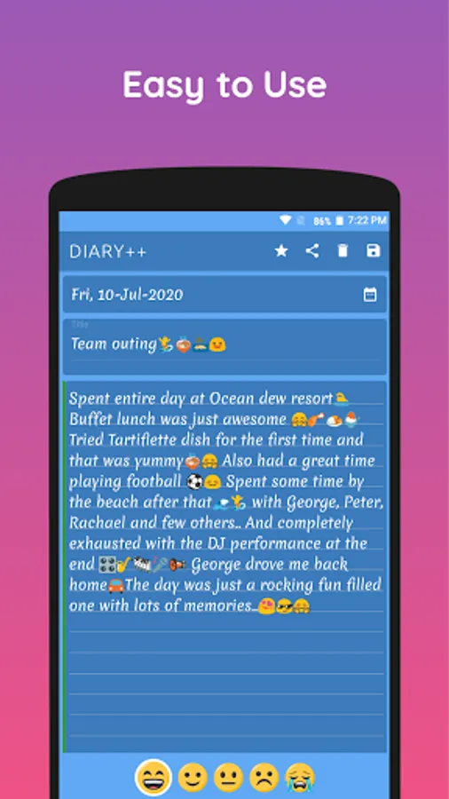This feature helps to create or edit diary entry with Title and Content for any dates. It also lets you select the emotion of the day with emoticons.