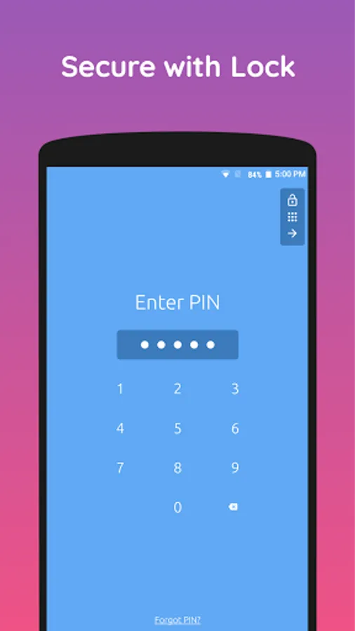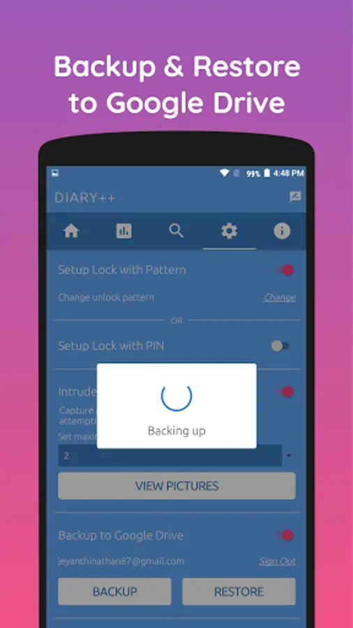 This feature helps to lock your app with 6 digit PIN code or Pattern to keep your diary secret. There is also a backup feature that lets you set your own secret questions and answers in case you forget the PIN or Pattern.