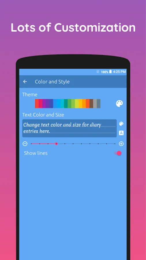 The UI is simple and neat with cool animation features for a better look and feel of the app. It provides a more professional experience. You can change the color of your diary and font, size of the font. Also, there are a lot of fonts to choose from, that you will love to try it out.
