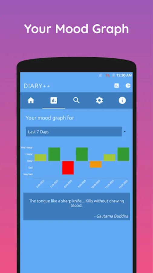 The two different graphs (Bar chart and Pie Chart) provided in this app helps to track your moods which are generated based on the emoticons chosen while creating diary entries.