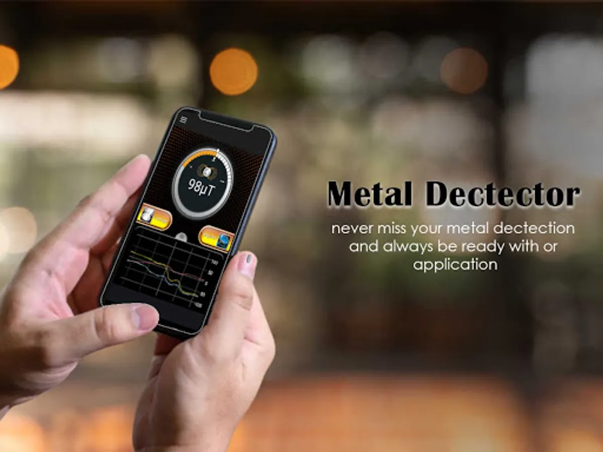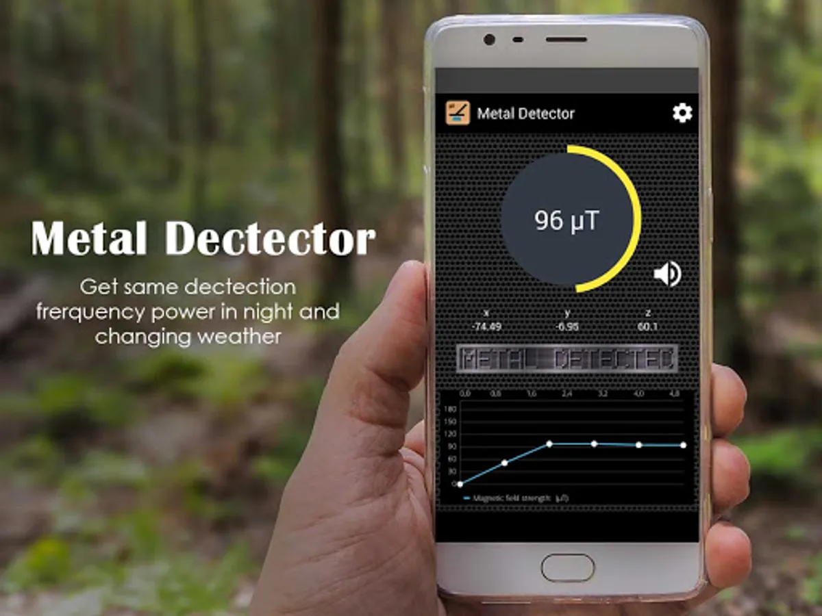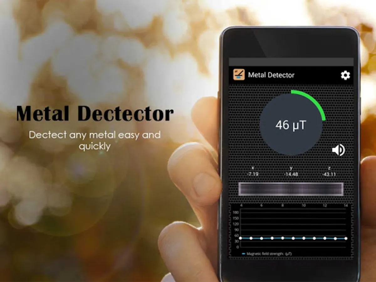 The Metal Detector application will detect the presence of metals nearby by measuring the magnetic field value. This useful application that can turn your phone into a digital metal detector uses the built-in magnetic sensor in your mobile device and shows the magnetic field level in μT (microtesla). The magnetic field level (EMF) in nature is about 49μT(microtesla) or 490mG(milli gauss); 1μT = 10mG.