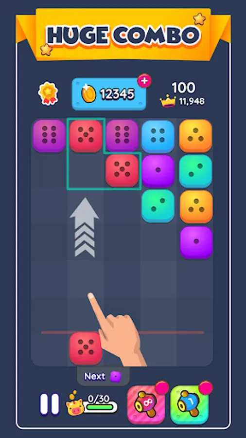 Swipe up to land each colored dice next to each other in either a row or column. Now think strategically about how they will merge to create the next numbered dice. You need 2 dice from the same color and number to merge into the next dice. There are bonus equipment you can use to help you if you’re stuck or your next move will cost you the game since it’s game over when you hit the top of the column without any merge.
