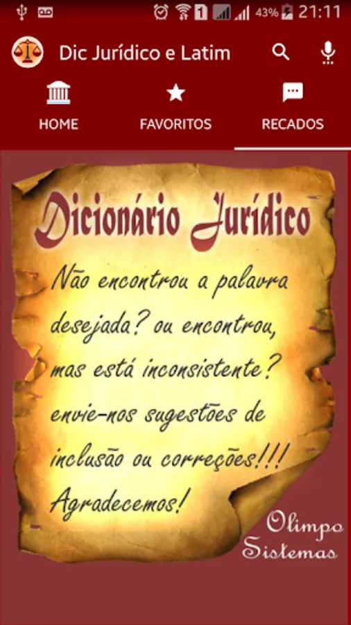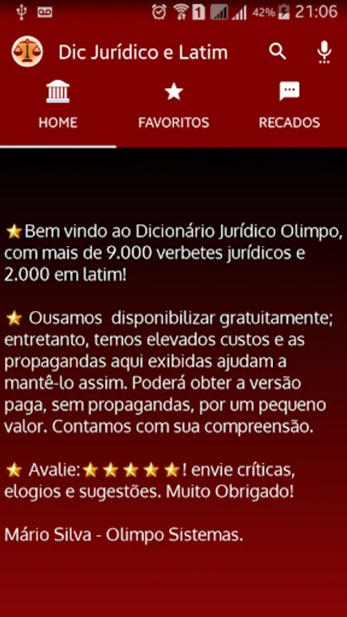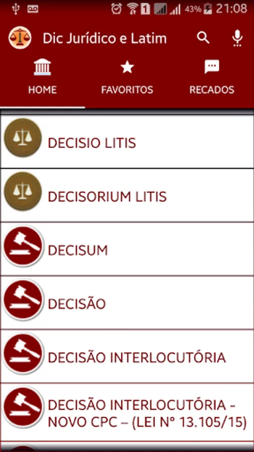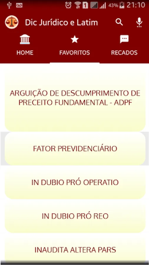 Free dictionary of legal and Latin terms offline, containing thousands of legal terms and expressions in Portuguese and Latin entries and expressions, directly on your device, without the need for internet connection. It has advanced search, including by voice and several display options, inserted in an interactive and friendly layout. An excellent tool for law students and operators, contestants and researchers. It is an application subject to constant improvements. Soon, we count on your collaboration, sending us emails with praise, criticism or suggestions. If you have difficulties with the installation or visualization on your device, contact us through facebook or at the address: mariobam@gmail.com.