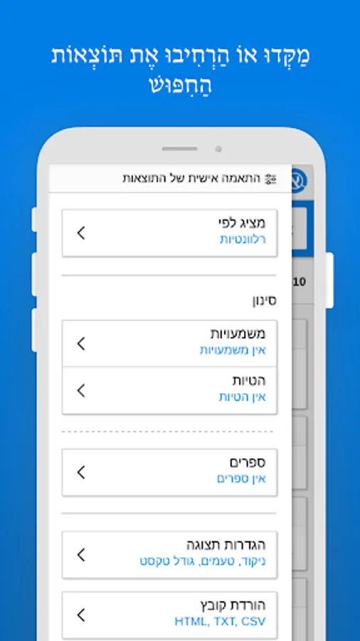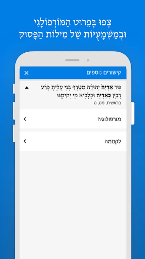 5- Search by Morphology and Meaning: Next to each Biblical verse in the search results appears three blue dots. Click on/ press the dots to show morphology details and meanings of each word in the given Biblical verse.