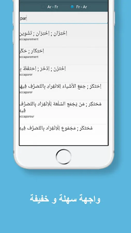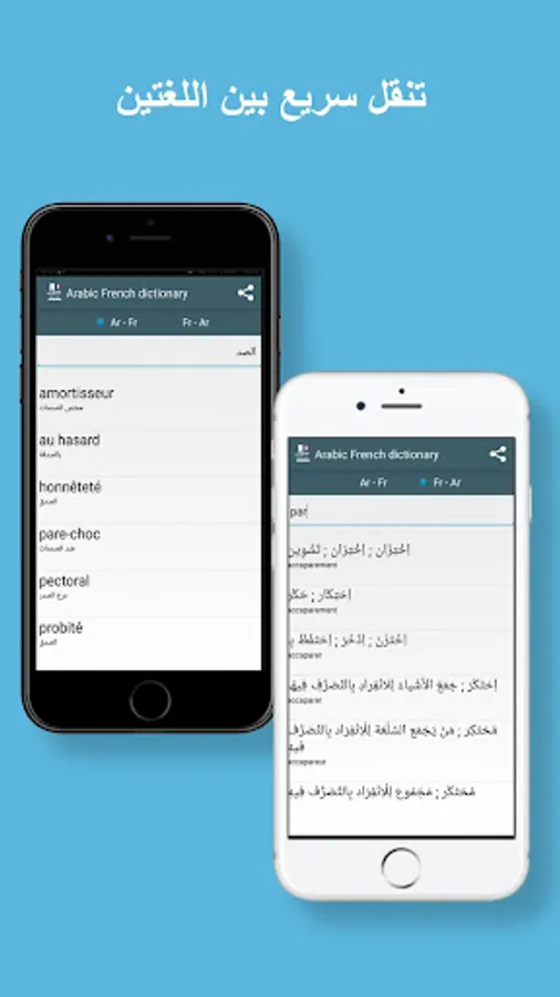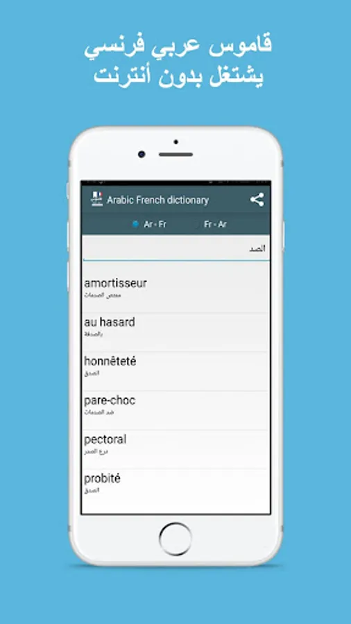 The dictionary supports French and Arabic to learn French across hundreds of thousands of French words