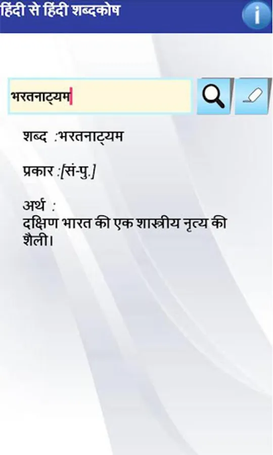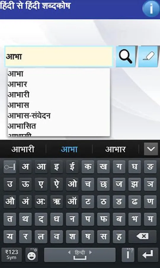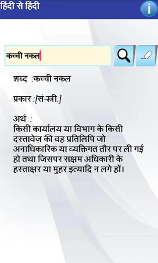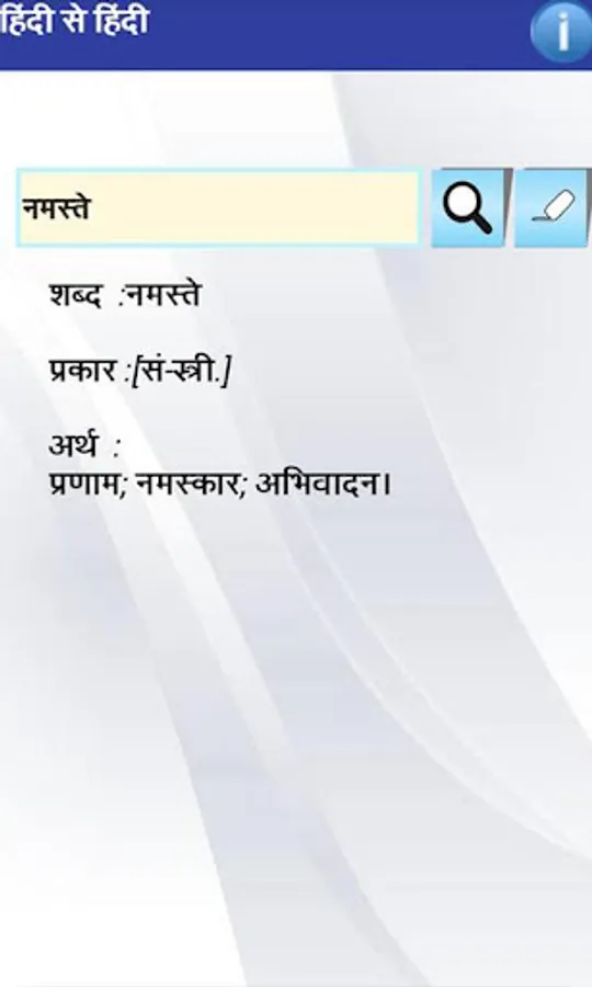 Hindi to Hindi offline and free dictionary. You can search Hindi words and can get Hindi meaning in descriptive manner. We have provided exact meaning with type of the word. In this dictionary you will find words as well as Hindi sentences with its Hindi meaning. When you type any word you will get approximate matching words so that searching is simple, and easily can find words. More than 65000 +English words with its Hindi meaning are available.