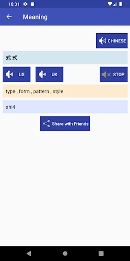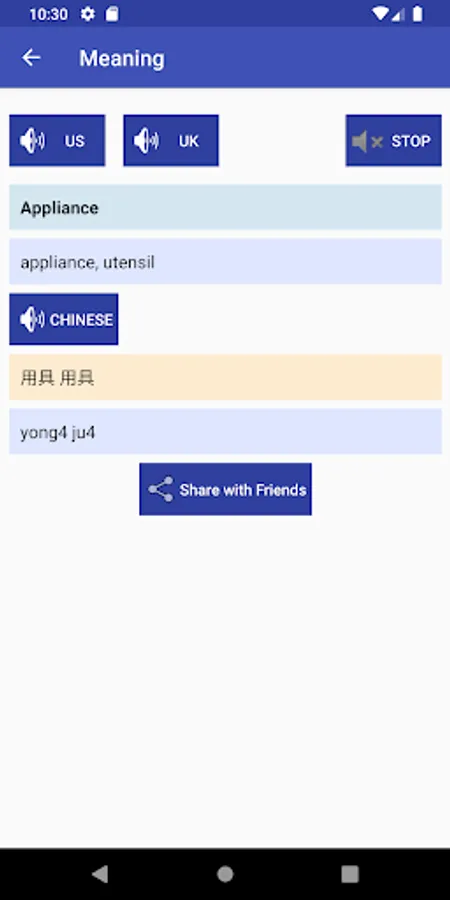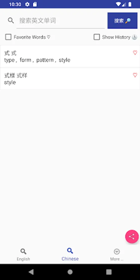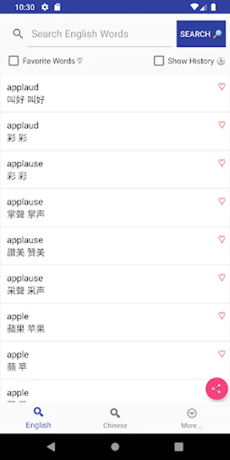 - Search the English word and it will display its Chinese translation.