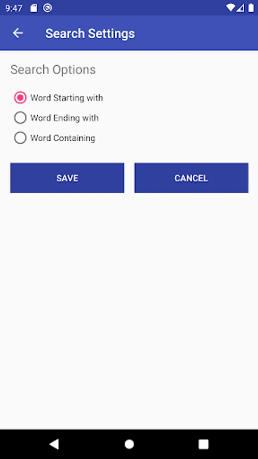 - "Search Options" feature that help to search the word "Starting" with searching word or "Ending" with searching word or "Containing" the searching word.