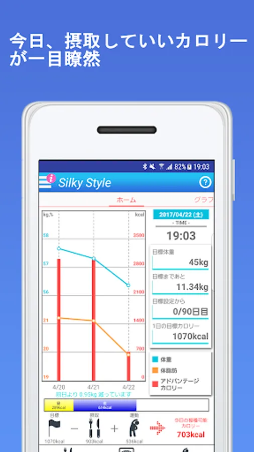 ダイエットを成功させたい期日、体重を入力すれば1日に摂取すべきカロリーが一目で分かります。基礎代謝、食事、運動を含めたカロリーを計算できる数少ないアプリです。ストレスの少ないダイエットをバックアップします。