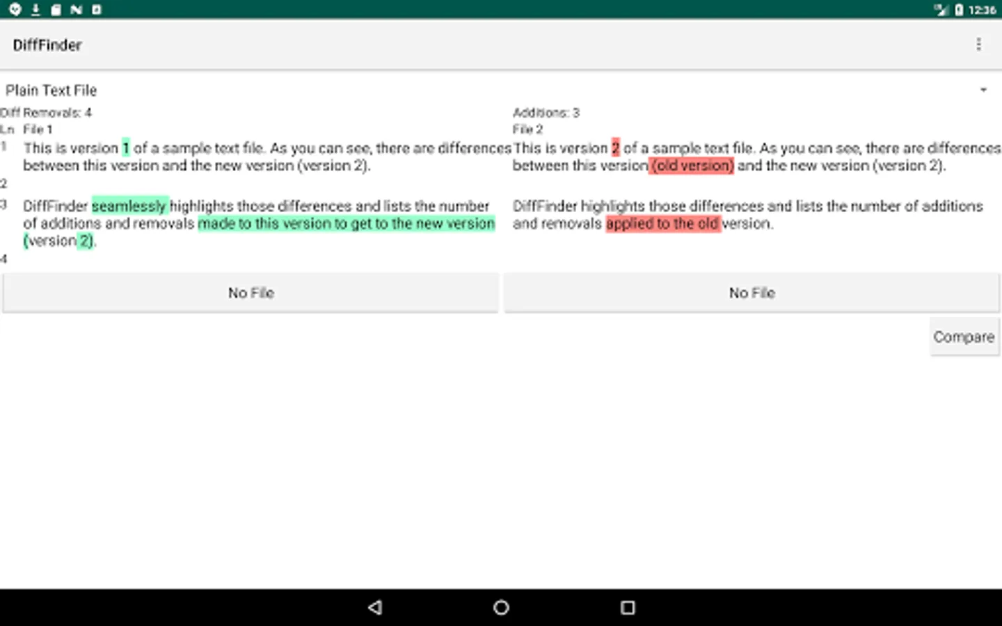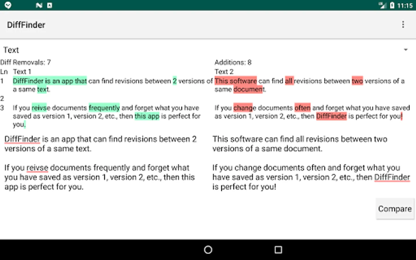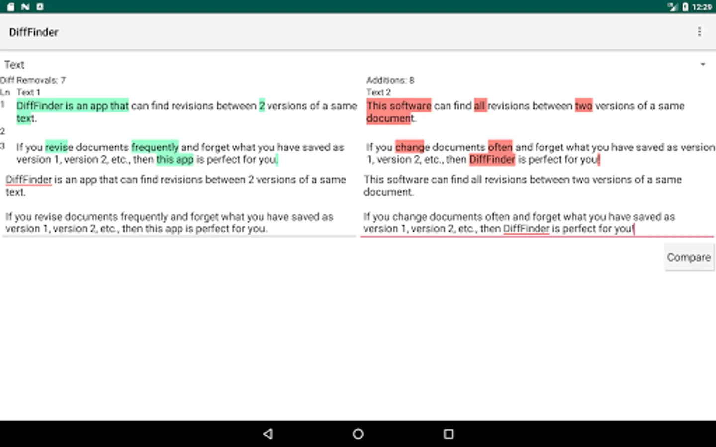 DiffFinder highlights the differences between two versions of a file (plain text, Docx, or PDF) or two versions of inputted text. It has the following features: