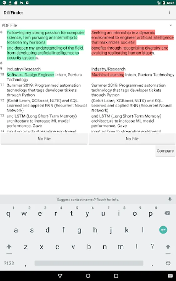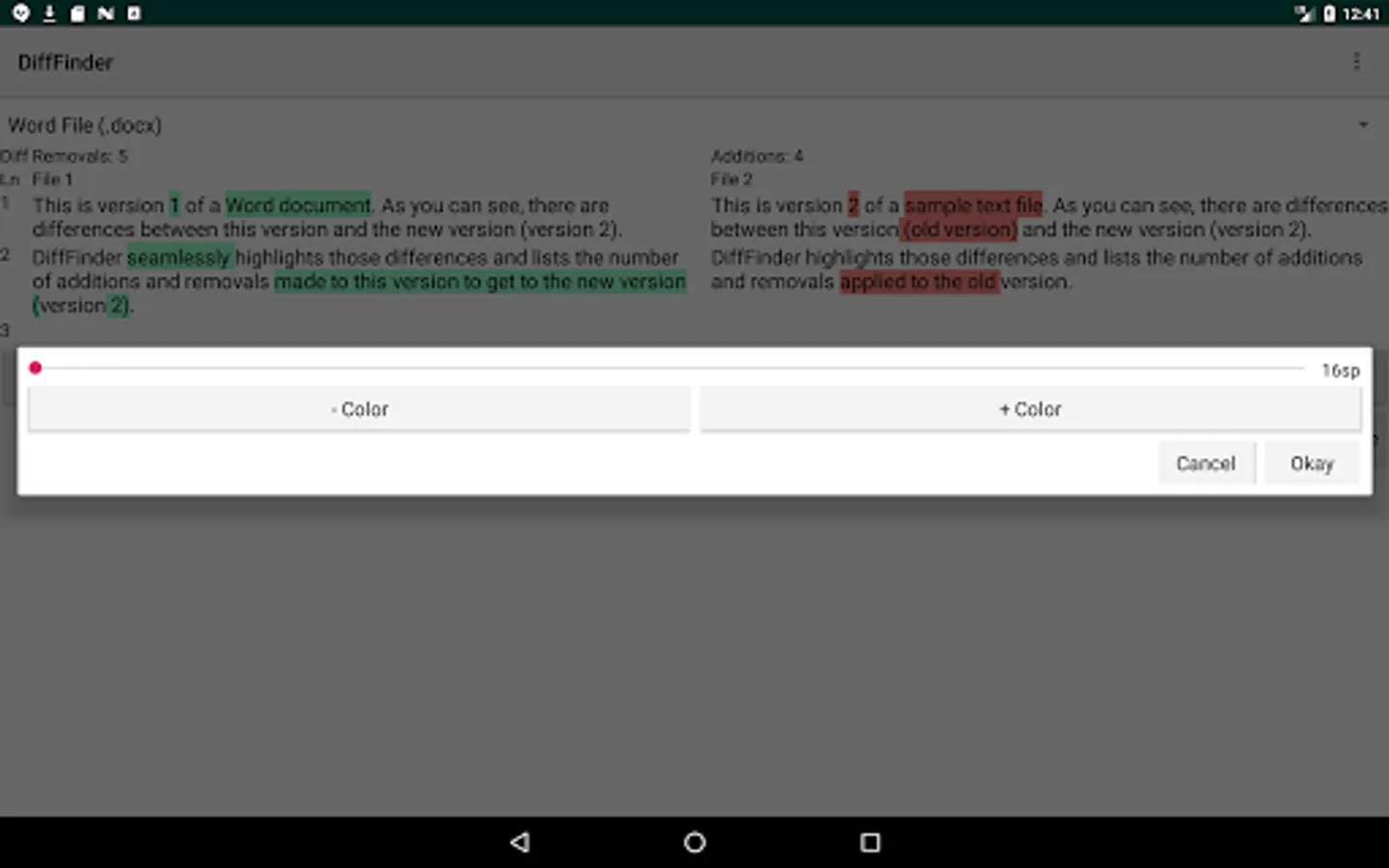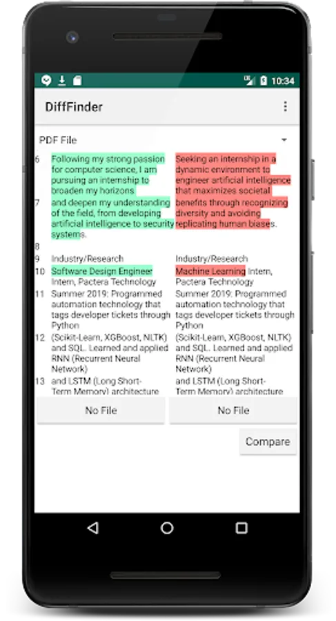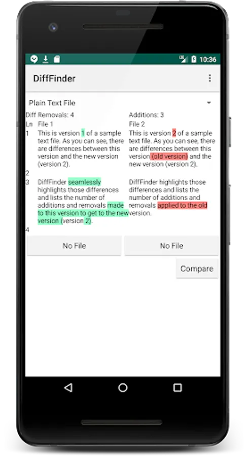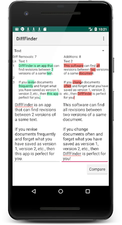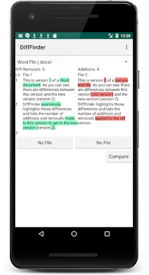 DiffFinder highlights the differences between two versions of a file (plain text, Docx, or PDF) or two versions of inputted text. It has the following features:
