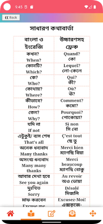 Bangla to French Learning (বাংলা থেকে ফ্রেঞ্চ বা ফরাসি) App is an easy-to-use app, that means you can learn basic French very easily.