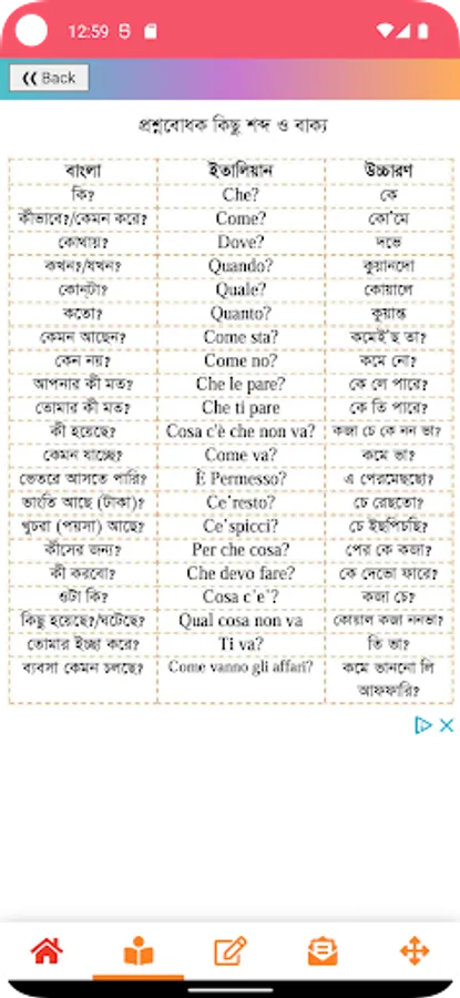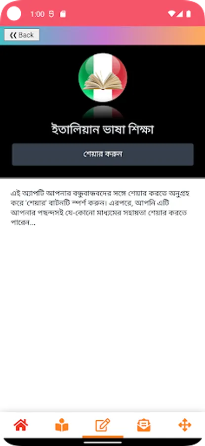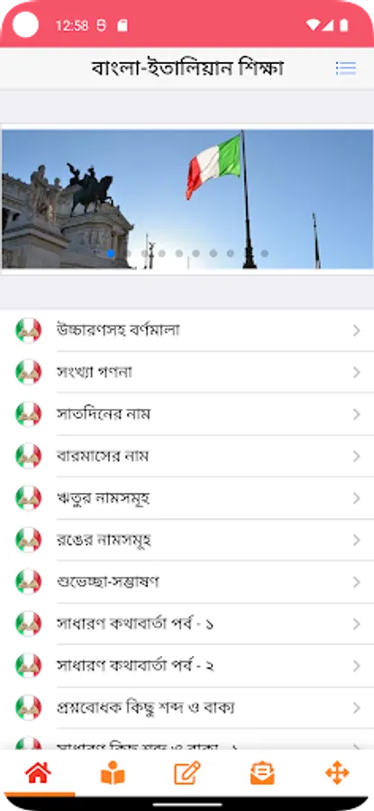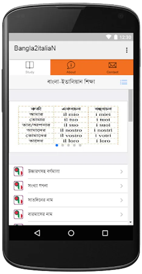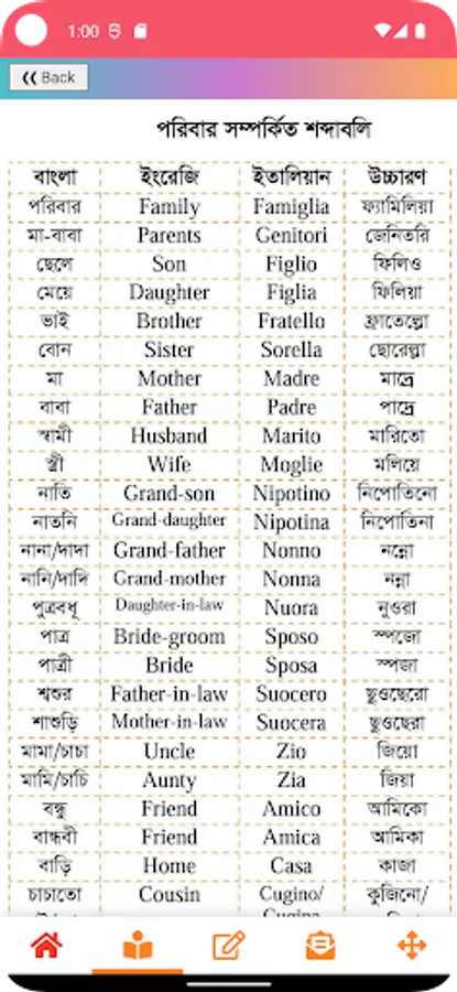 Our app named Bengali to Italiano or Bangla to Italian Learning App (বাংলা থেকে ইতালিয়ান ভাষা শিক্ষা) will help you to learn these two language very easily. Bangla to Italian Learning App is free for you with lots of content.