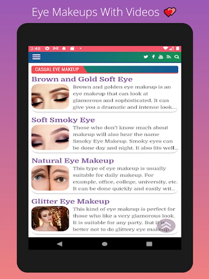 Eye Makeup Tutorial App With Step by Step Guide will be your best friend by helping you to make you beautiful. It doesn't matter if you are looking for Casual Eye Makeup or any kind of special days makeup... Festive Eye Makeup or anything... All you will find on our Eye Makeup app.