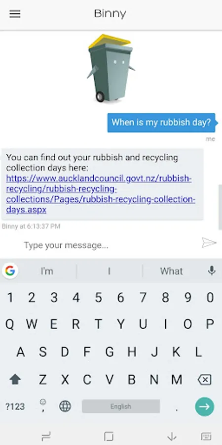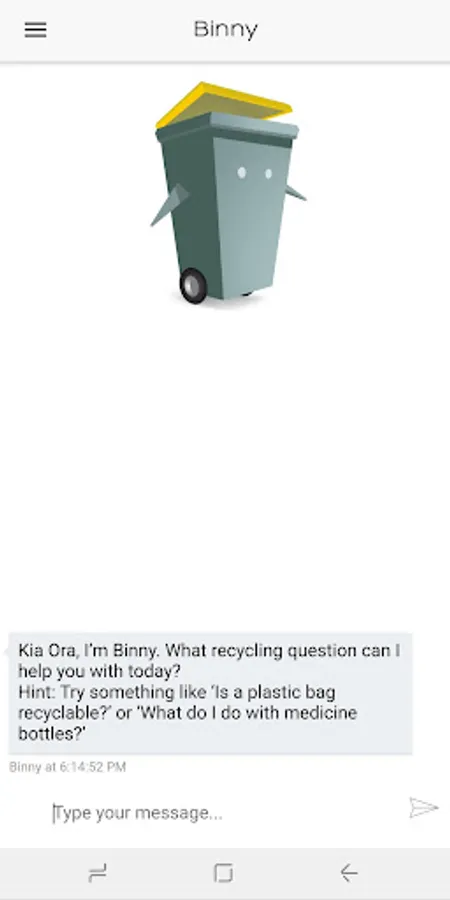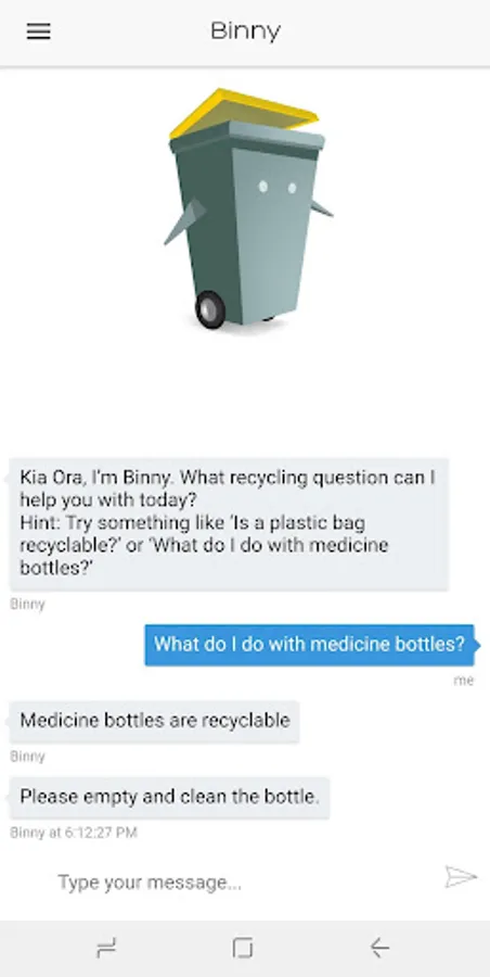 Binny is a waste reduction chatbot. Binny's mission is to help the people of Auckland correctly sort their unwanted items into the correct waste and recycling bins.