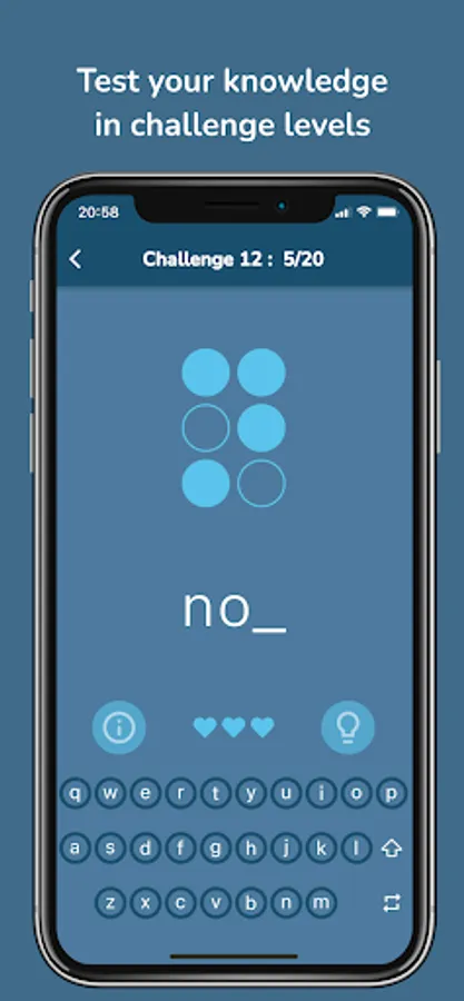 In short, a level focuses on introducing new characters with a small amount of repetition while a challenge trains what you’ve learnt already. In a level, you can click the INFO BUTTON (on the left) to read some TIPS and the hint button (on the right) to see the correct answer. The hints are infinite and always free. In a challenge, you can’t use the hint button anymore and you must make less than 3 mistakes to pass it.