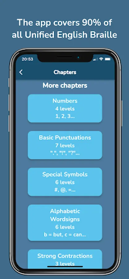 - 59 levels and 29 challenges in total to teach, train and test more than 90% of the entire Unified English Braille knowledge.