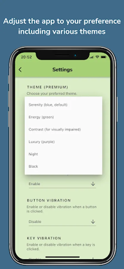 - On the Settings page, you can switch on and off button sound, key sound, button vibration, key vibration, vibration on error and keyboard layout.