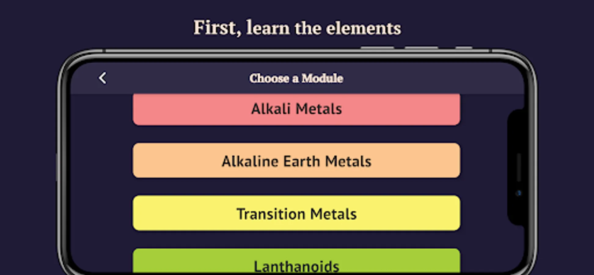 - a different color for each module (Transition Metals, Metalloids, Noble Gases etc.) for better memorization.