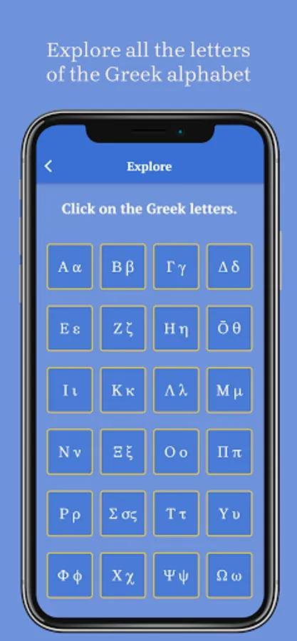 - the Explore page allows users to see all the letters of the Greek alphabet (upper- and lowercase) and click on them to see their English names and listen to their pronunciation.