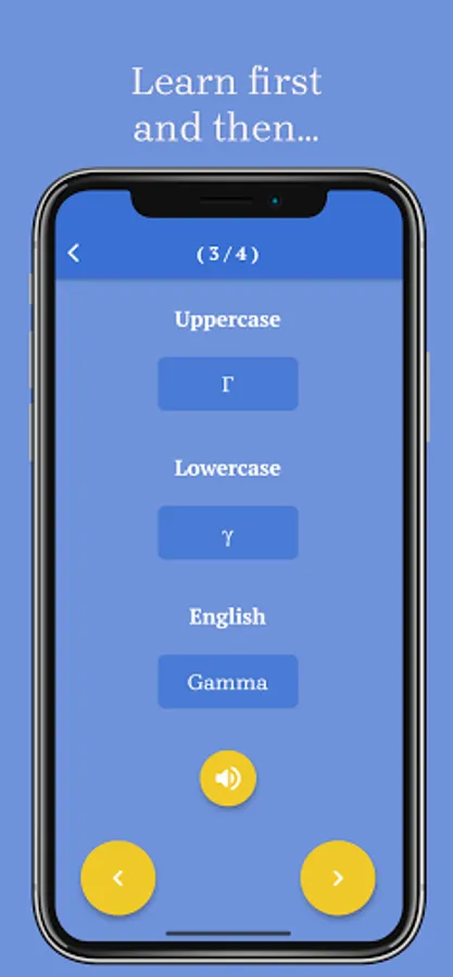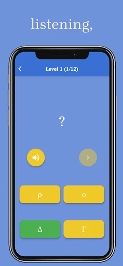 In the Reading mode, you can learn the letters from Greek to English or from English to Greek. At the beginning of each level, four letters are introduced one by one and you should try your best to remember them. After going through 4 learning cards, you will start a quiz game, which trains and enhances your knowledge. Along the way, you can always listen to the English pronunciation of the letters.