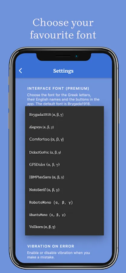 Under Settings in Greek Alphabet Academy, you can change the font of the Greek letters and their English names as well as the button text. You can also enable/disable the button sound, correct/wrong sound (when you answer a question correctly or wrong), button vibration and vibration on error.