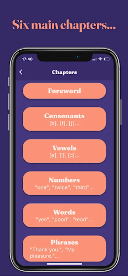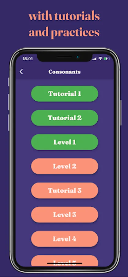 -in Chapter Consonants, there are 12 Tutorials teaching how to read all the 24 consonants and 40 Levels for practising them.