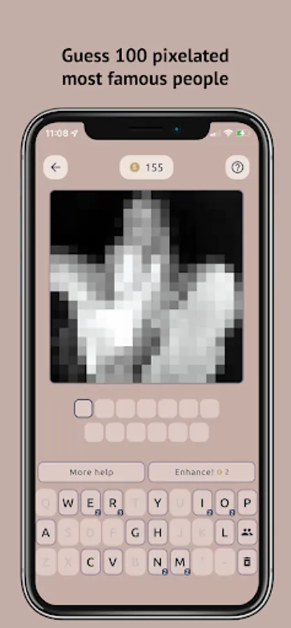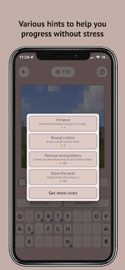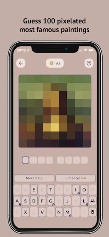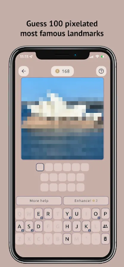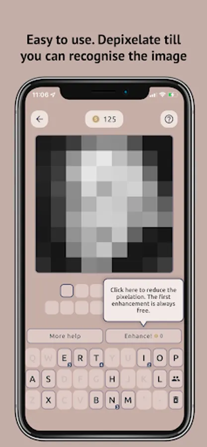 - various hints to help you progress (depixelate, reveal a correct letter, remove all wrong letters, reveal answer).