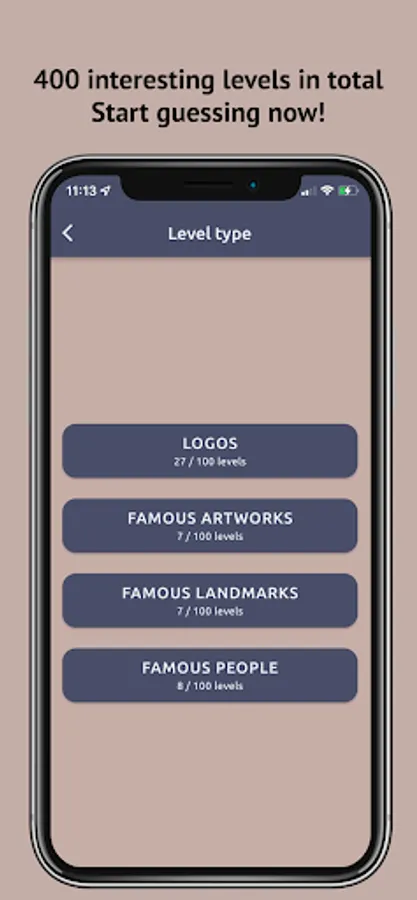 - 400 levels in total covering 100 famous logos, 100 famous artworks, 100 famous landmarks and 100 iconic portraits of the most famous people in history.