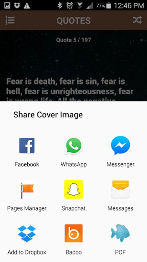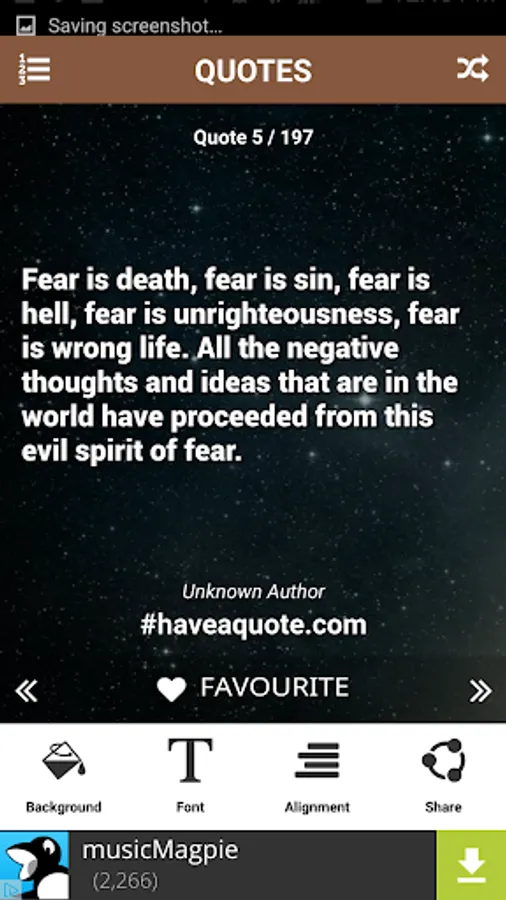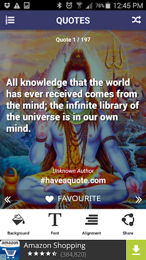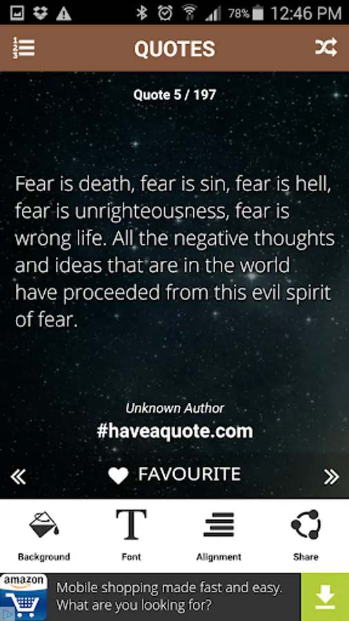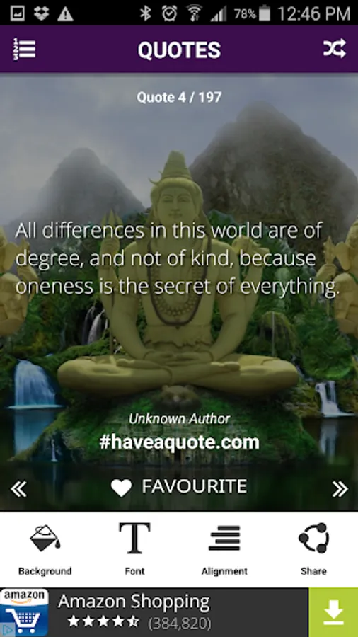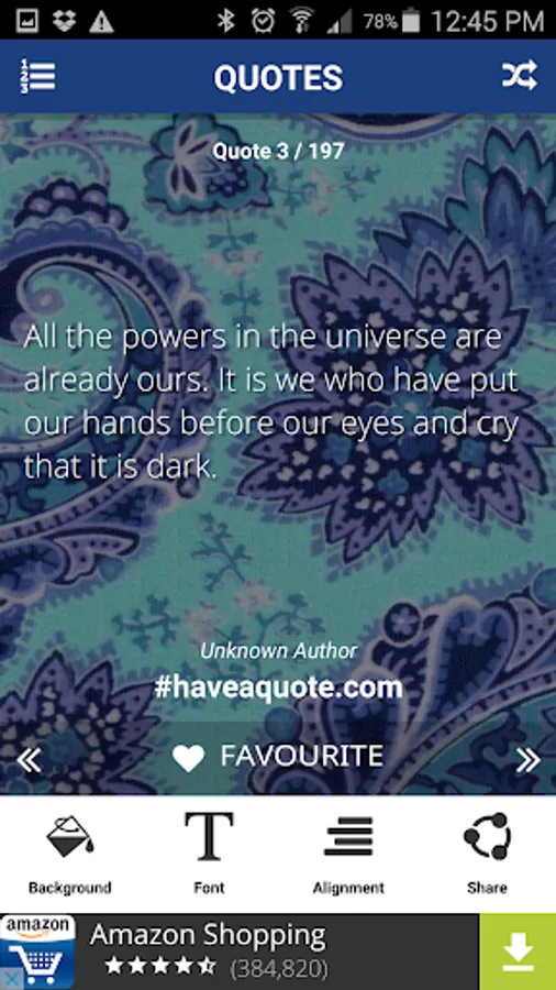 Use the shuffle button to present you with a random quote. Click the favorite icon to save the quotes to your favorites list.