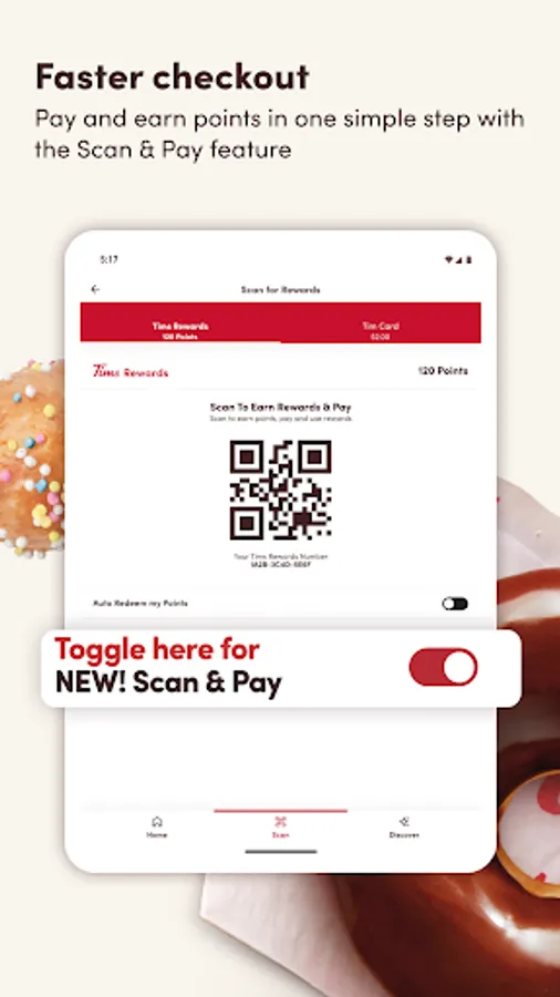 Save time at checkout with Scan & Pay. You can now pay for your order and earn Tims Rewards Points with one simple scan of your app.