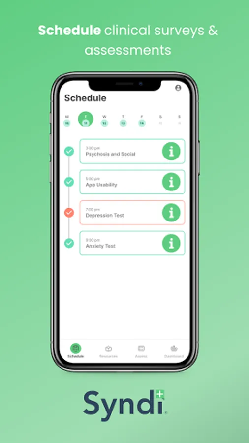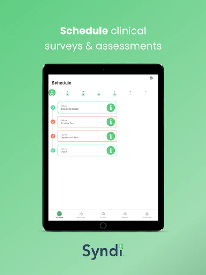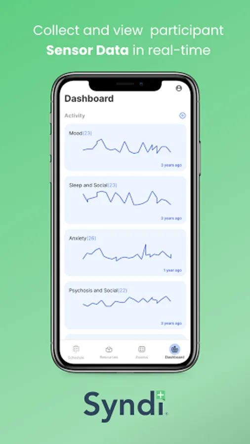 The Syndi Clinic App includes functionality for continuous collection and analysis of passive smartphone data, such as GPS, call and text logs, exercise/activity and sleep patterns, as well as active assessment through multiple, customisable data streams and variable scheduling to prompt in-app surveys and cognition tests.