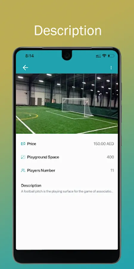 التطبيق هو الأول من نوعه حيث يقدم خدمات الحجز أون لاين، بطريقة آمنة وسريعة وفعالة لحجز الملاعب والصالات الرياضية عبر الإنترنت.