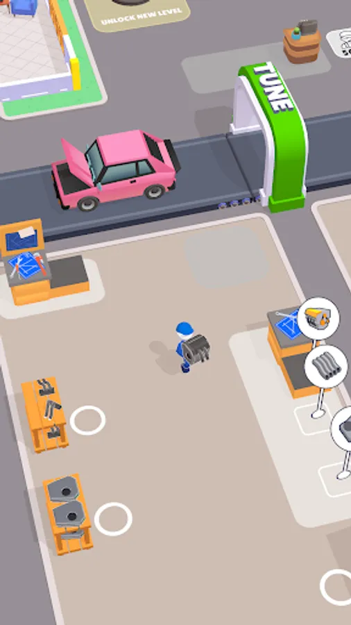 From rusty clunkers to luxury sports cars, clients will bring their vehicles to your shop. You have a conveyor belt running through different service zones, each with its unique abilities. From tyre service and gas stations to car wash and car paint, and even tuning - there's a service for every need.