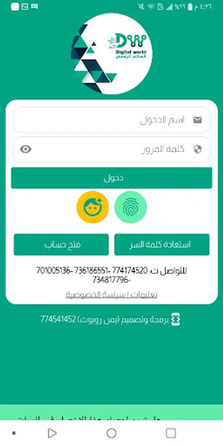 The digital world is a diversified electronic payment application, services and distinguished, with attractive designs that are easy to use and varied. These interfaces were designed by experts in the design of customer-friendly and distinctive interfaces. The application contains many windows and interfaces that allow easy use of the customer for all services.