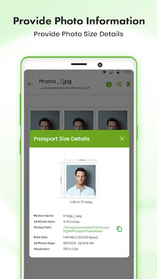 It is the fastest and easiest way to create digital passport size photos for use as ID, driver's license, passport, and other photo needs.Take your photo from the gallery or click the new one from your Android device. To customize the photo select from over 50+ backgrounds with a variety of different filters to change the mood of the photo before adding a border and corner style.