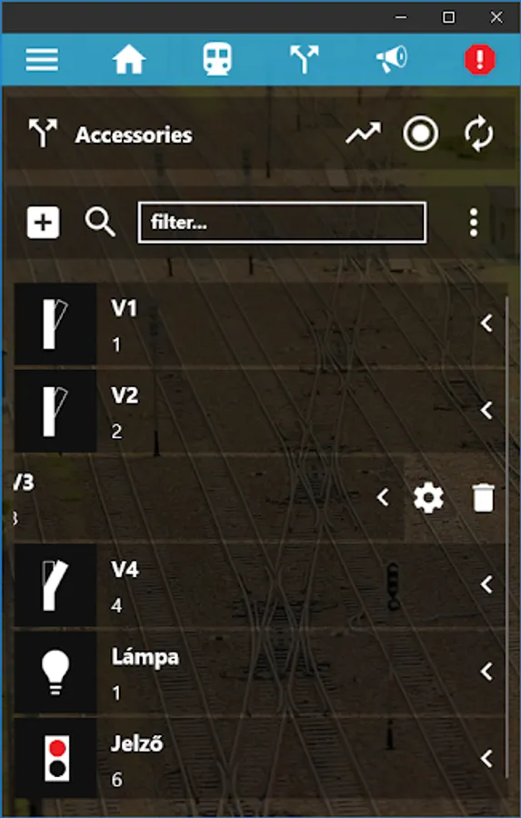 You can add all your accessories (turnouts, lights, etc.) and switch them from the app.