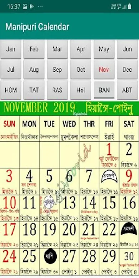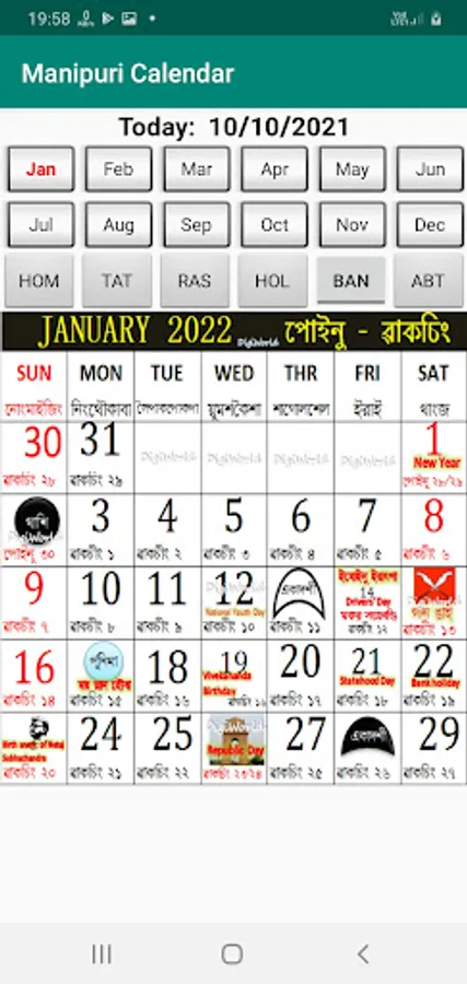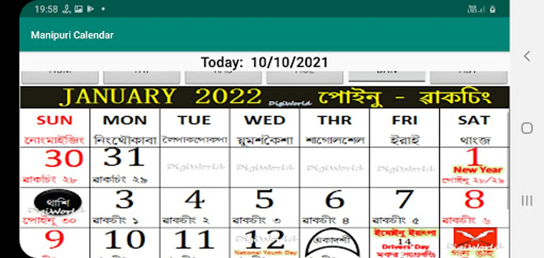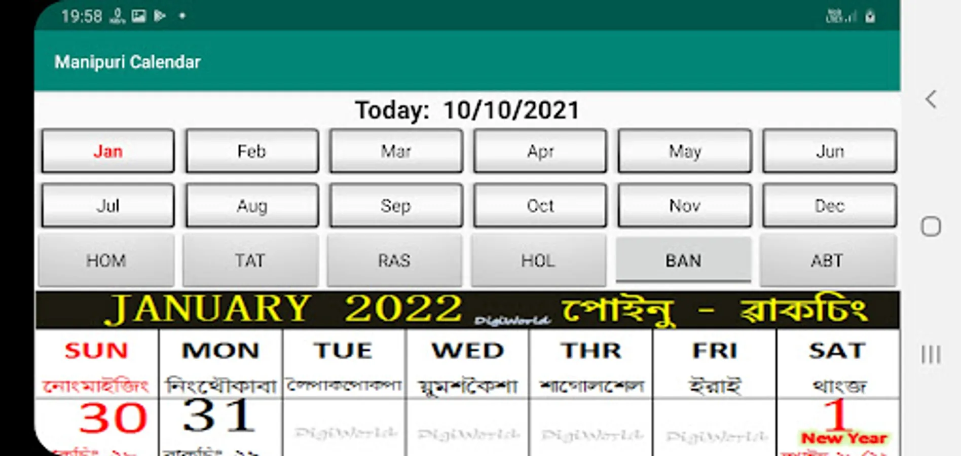 Manipuri Lunar Calendar is just like the traditional Manipuri Calendar. Now in this app you will find the calendar of 2019, 2020,2021, 2022 and 2023. Just tap on the "HOM" button and select the years. TAT button for Tatnaba numit, Thasi maikei, Nupa nupi paknaba, Hakchang Chongbagi phal, Pokpa numitki phal, Mangi phal, Laicha, Laijao leiba mapham, Chum tabagi phal, Uchek tongbagi phal, Khoi sabagi phal etc. RAS button for Rashiphal, HOL button for holiday list. Just tap on "MEi" or "BAN" toggle button for choosing scrips. It runs in android device and you can keep it in your pocket.