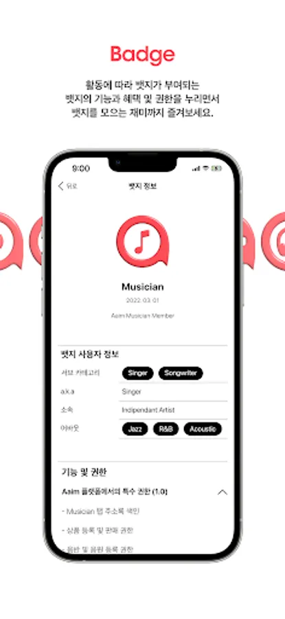 You can get the 'Aaim User' badge, which is provided at the same time you sign up, and badges such as 'Musician', 'Creator', 'Agency', 'Distributor', etc. depending on the activity area for each user. Each badge has features optimized for the activity area Access rights and benefits are included.